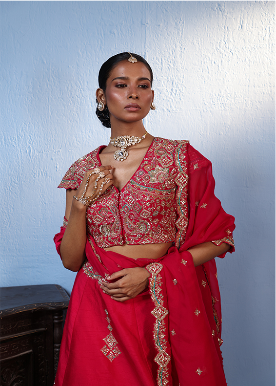 RED COLOUR PLACEMENT WORK LEHENGA